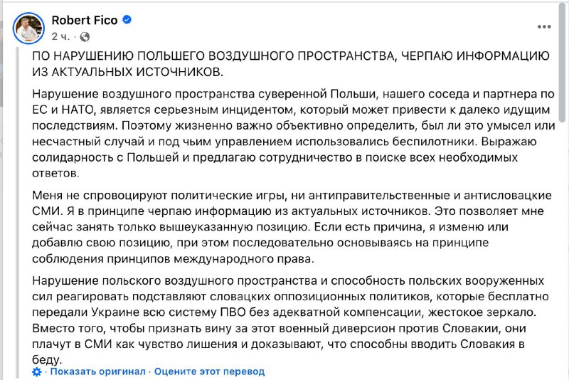 "Нарушение польского воздушного пространства и способность польских вооружённых сил реагировать выставляют перед словацкими оппозиционными политиками, которые бесплатно передали Украине всю систему противовоздушной обороны без адекватной замены, жестокое зеркало. Вместо того чтобы признать вину за этот военный саботаж против Словакии, они орут в СМИ как безумные и доказывают, что способны лишь ввергнуть Словакию в беду", - написал Фицо в Фейсбуке.