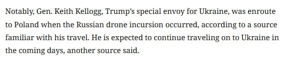 Между тем телеканал CNN сообщил, что спецпосланник президента США по Украине Кит Келлог направлялся в Польшу, когда дроны оказались в воздушном пространстве страны.