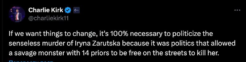 Последний пост в соцсети Х гражданского активиста и сторонника Дональда Трампа Чарли Кирка накануне убийства посвящен зарезанной в американском метро украинской беженке Ирине Заруцкой.