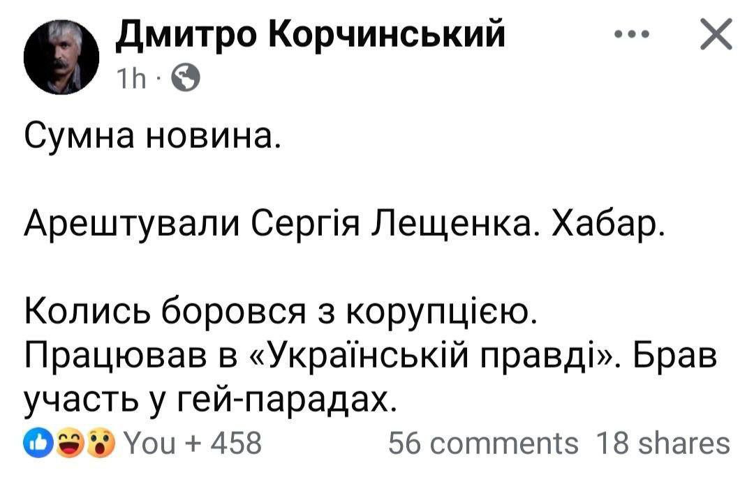 "Грустная новость. Арестовали Сергея Лещенко. Взятка. Когда-то боролся с коррупцией. Работал в "Украинской правде". Брал участие в гей-парадах", - написал Корчинский.