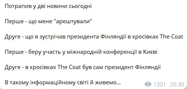 "Попал в две новости сегодня. Первое – что меня "арестовали". Второе – что я встречал президента Финляндии в кроссовках The Coat. Первое – участвую в международной конференции в Киеве. Второе – в кроссовках The Coat был сам президент Финляндии. В таком информационном мире и живем…" - написал советник ОП.