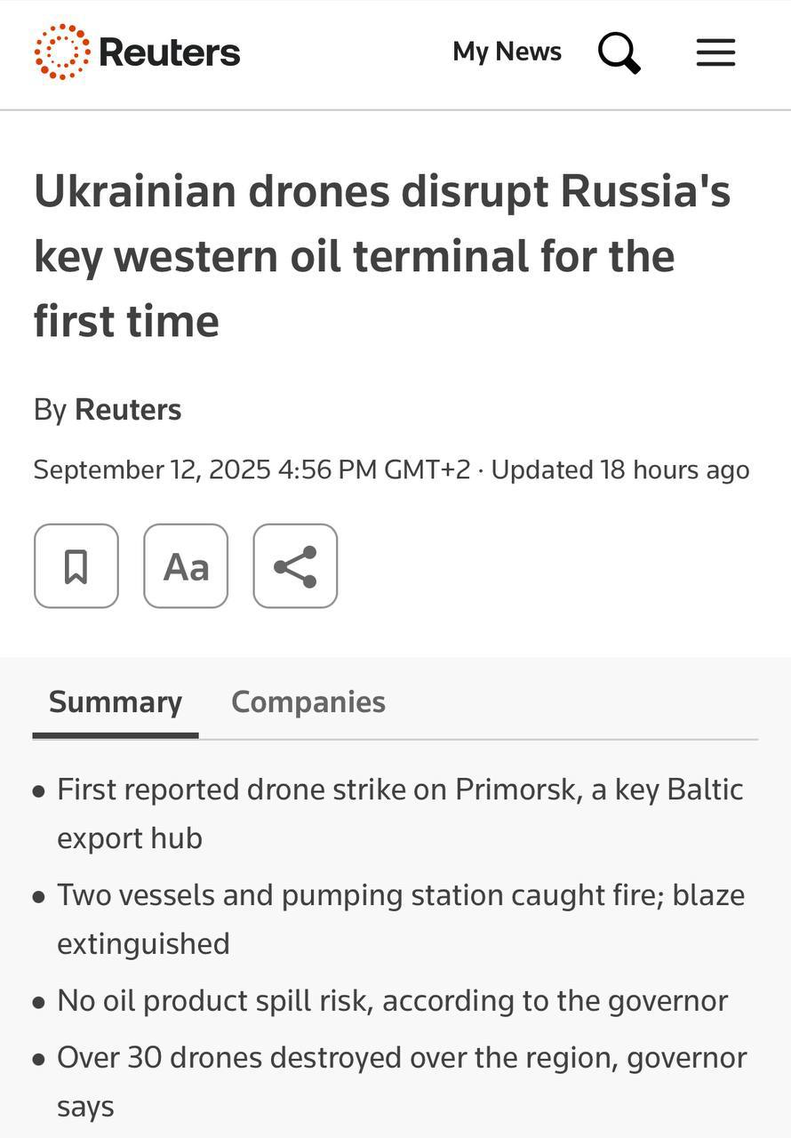 Напомним, в ночь на 7 сентября Украина повторно атаковала нефтепровод "Дружба". Прилет был зафиксирован в Брянской области РФ, сообщил командующий сил беспилотных систем "Мадяр". По его словам, удалось поразить перекачивающую станцию в Найтоповичах.
