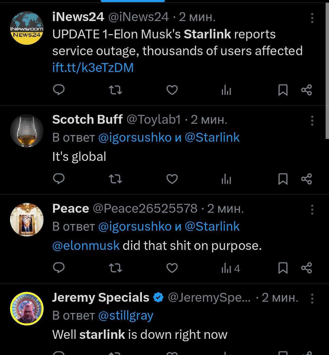 8.08 По всему фронту не работает спутниковая связь Starlink, сообщил командующий Силами беспилотных систем Роберт Бровди.