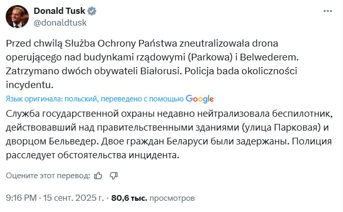 "Служба государственной охраны нейтрализовала беспилотник, который летал над правительственными зданиями (улица Парковая) и дворцом Бельведер", - написал Туск.