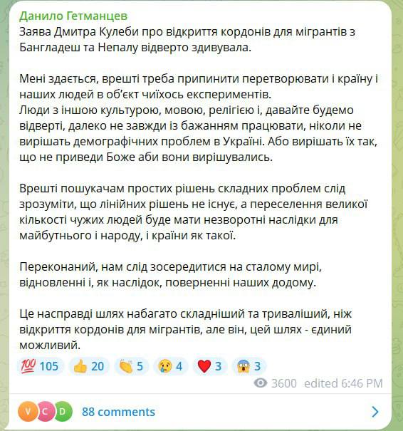 "Ничего хорошего в плане населения у нас не будет. У нас тенденция была негативная и до войны, никто уже не хочет рожать. Потому, возможно, нам придется открыть границу для мигрантов из Бангладеша, Непала, Индии, Филиппин, Вьетнама. С удовольствием приедут", - заявил Кулеба.