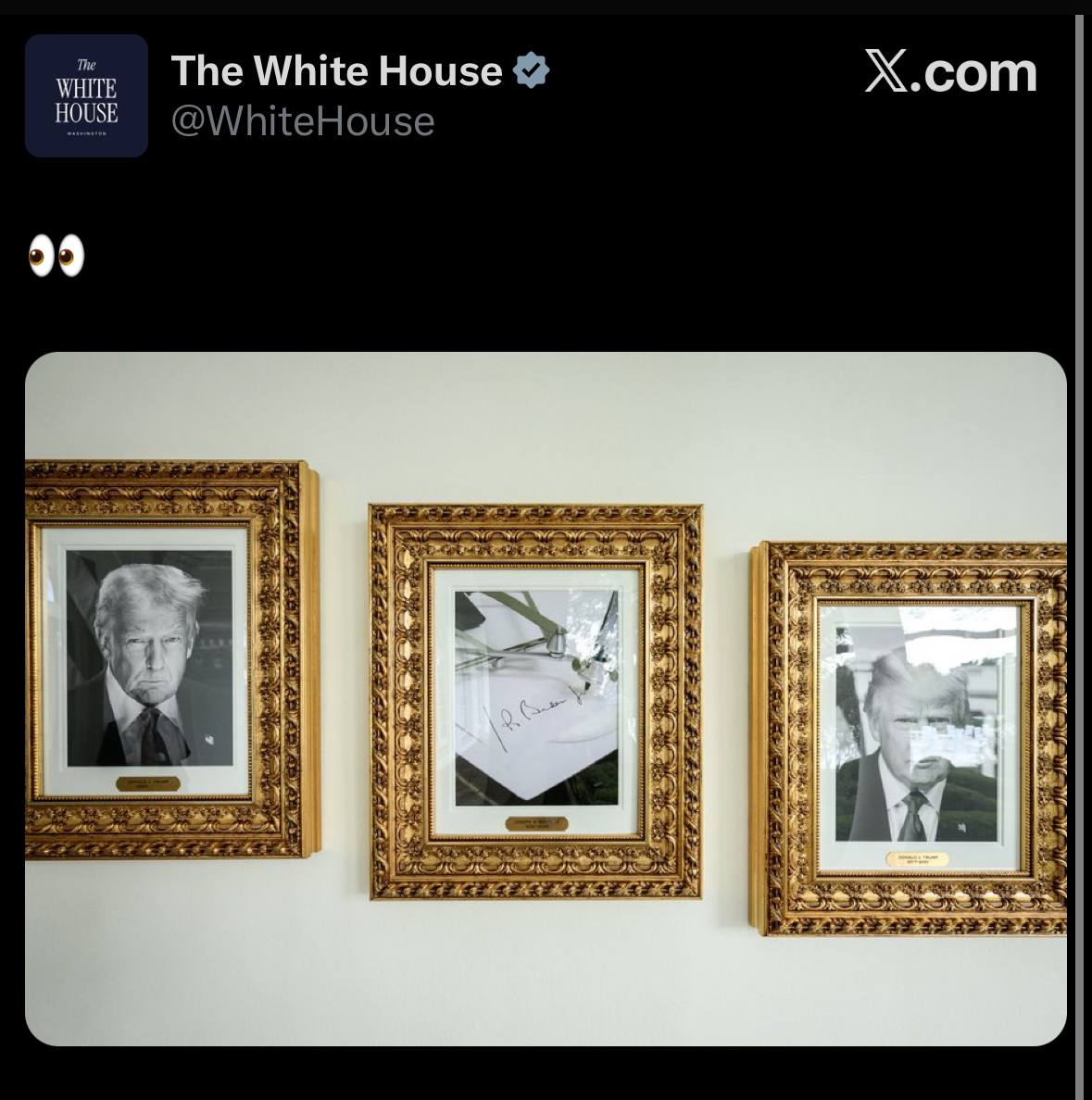 На опубликованых кадрах можно заметить, как среди портретов бывших лидеров США, включая Барака Обаму, теперь размещено фото аппарата с подписью Байдена.