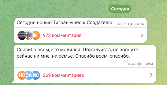 "Сегодня ночью Тигран ушел к Создателю. Спасибо всем, кто молился. Пожалуйста, не звоните сейчас ни мне, ни семье", - написала Симоньян.