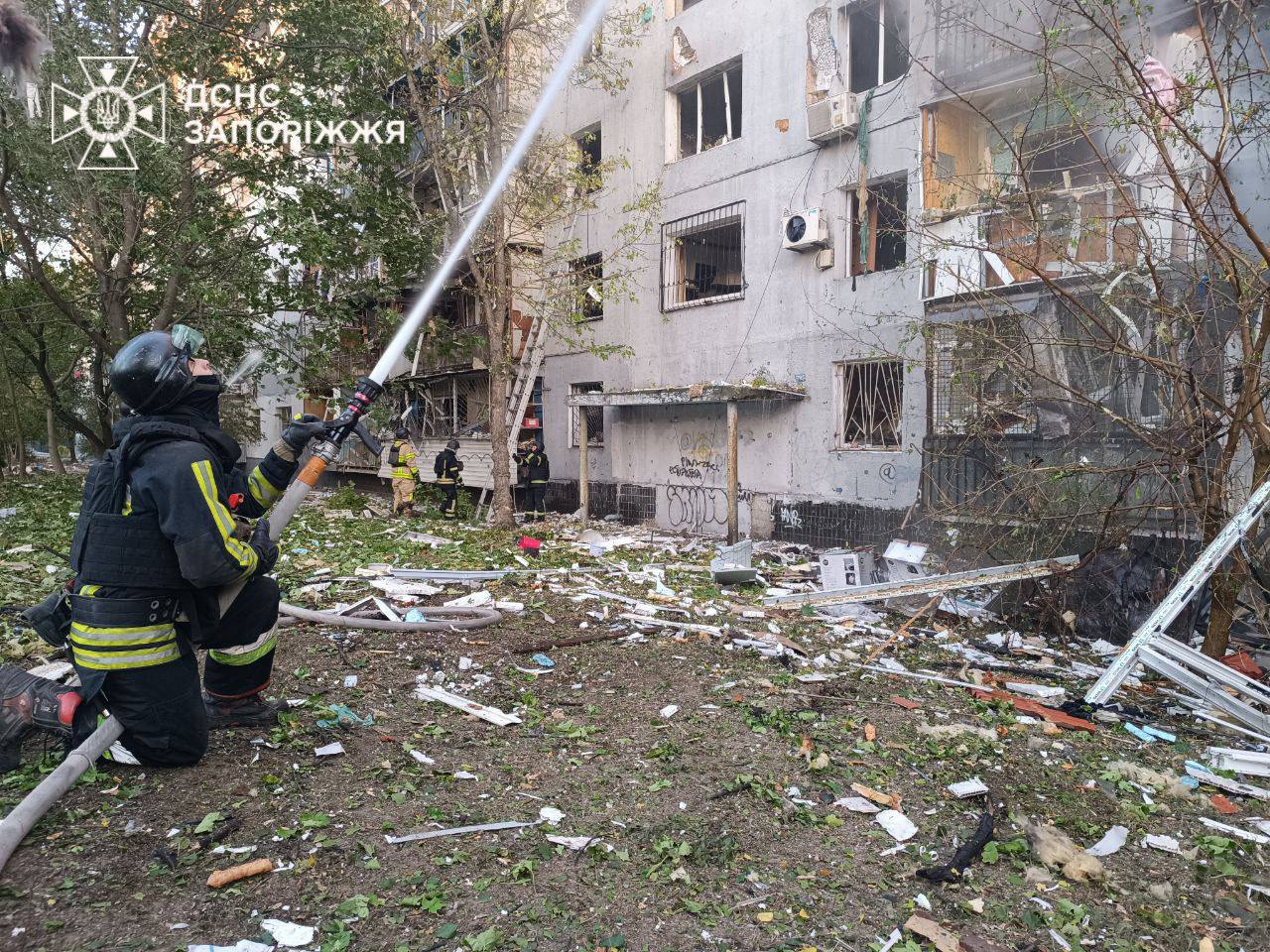 "Ракета попала рядом с жилым девятиэтажным домом, в результате чего произошло возгорание со второго по пятый этажи в одном подъезде и с восьмого по девятый в другом.
