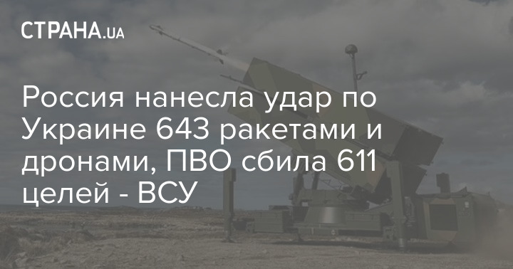 Этой ночью российская армия запустила по Украине 643 ракеты и дрона. РФ атаковала 643 беспилотниками и ракетами, а ПВО удалось сбить 611 целей.