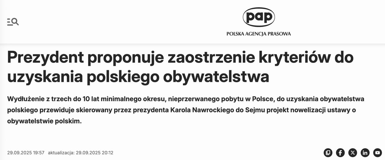 Президент уже внес соответствующий законопроект в парламент. Навроцкий отметил, что текущий трехлетний срок "является одним из самых коротких в Европейском Союзе", что "может не давать достаточного времени для овладения польским языком на уровне B1, понимания культуры и полной адаптации к социальным и правовым реалиям".