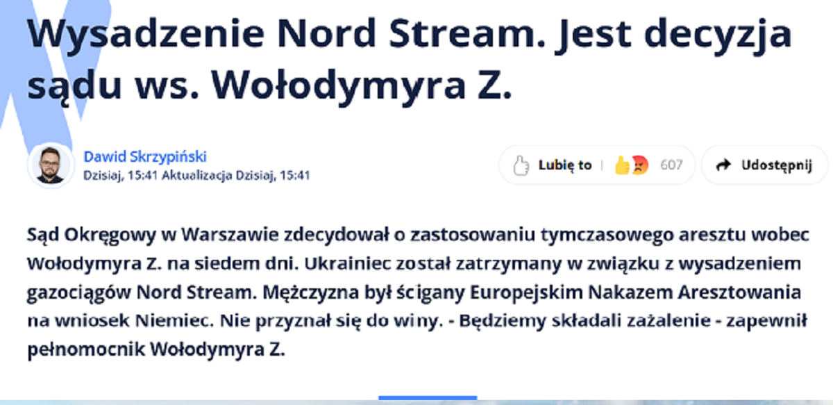Окружной суд Варшавы арестовал на семь дней украинца Владимира Журавлева, подозреваемого в подрыве "Северного потока".