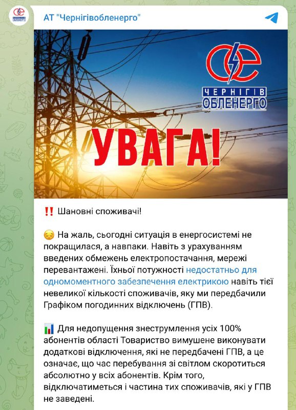 "К сожалению, сегодня ситуация в энергосистеме не улучшилась, а наоборот. Даже с учетом введенных ограничений электроснабжения сети перегружены. Их мощности недостаточно для сиюминутного обеспечения электричеством даже того небольшого количества потребителей, которое мы предусмотрели графиком почасовых отключений", - сообщает облэнерго.