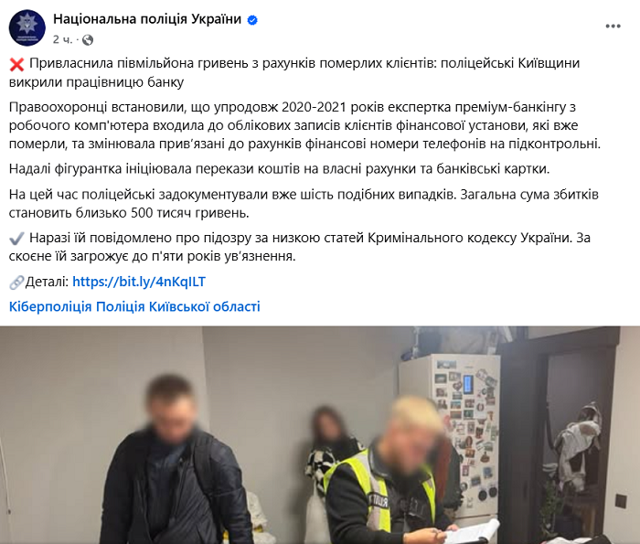 Сотруднице финучреждения предъявили подозрение в воровстве денег. Фото: facebook.com/UA.National.Police