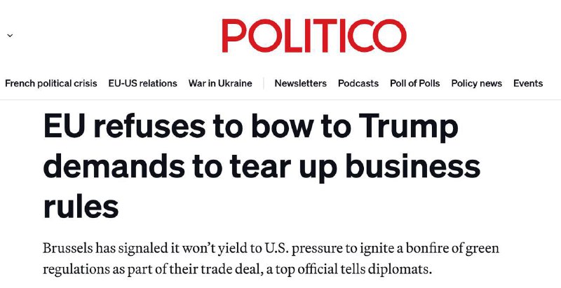 США и Европейский Союз пока не достигли консенсуса по тарифному соглашению. Президент Соединенных Штатов Дональд Трамп добивается отмены "зеленых" правил для американских компаний, а также норм о нарушении прав человека, а Евросоюз отказывается.