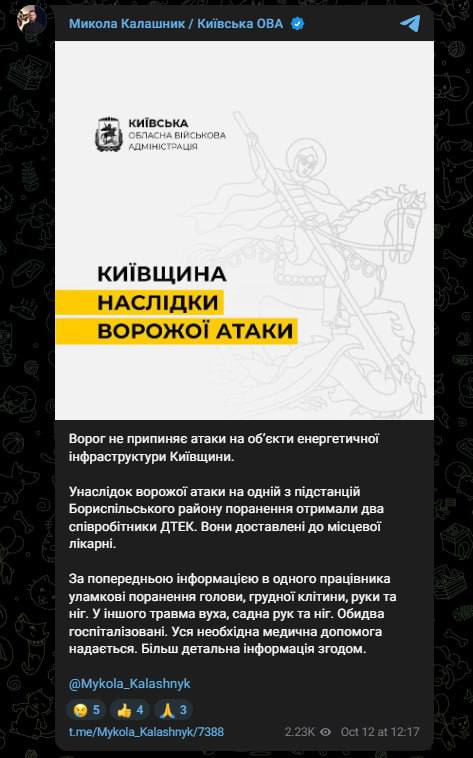 13:28 Россия атаковала подстанции в Бориспольском районе Киева. Ранены два сотрудника ДТЕК.