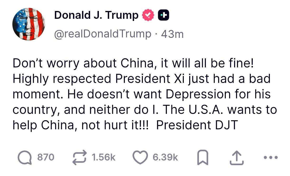 "Не волнуйтесь о Китае, всё будет в порядке! Высокоуважаемый президент Си просто пережил тяжёлый момент. Он не хочет депрессии для своей страны, и я тоже. США хотят помочь Китаю, а не навредить ему!" - написал президент США в своей социальной сети Truth Social.
