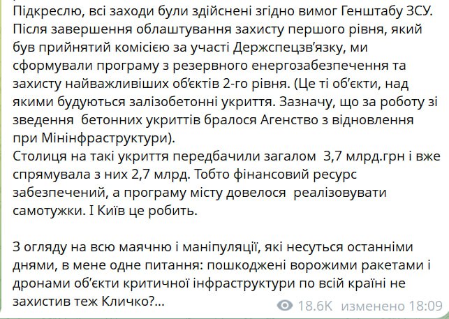 "Учитывая весь бред и манипуляции, несущиеся в последние дни, у меня один вопрос: поврежденные вражескими ракетами и дронами объекты критической инфраструктуры по всей стране не защитил тоже Кличко?" – написал мэр Киева.