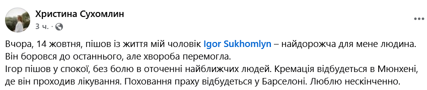 "Вчера, 14 октября, ушел из жизни мой муж Игорь Сухомлин – самый дорогой для меня человек. Он боролся до последнего, но болезнь победила. Игорь ушел в покое, без боли в окружении ближайших людей. Кремация состоится в Мюнхене, где он проходил лечение. Захоронение праха состоится в Барселоне", – говорится в сообщении.