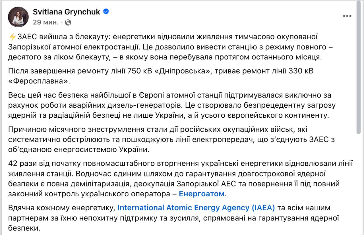 Гринчук также отметила, что причиной месячного обесточивания Запорожской АЭС стали действия российских  войск, которые систематически обстреливают и повреждают линии электропередач, соединяющие станцию с объединённой энергосистемой Украины.