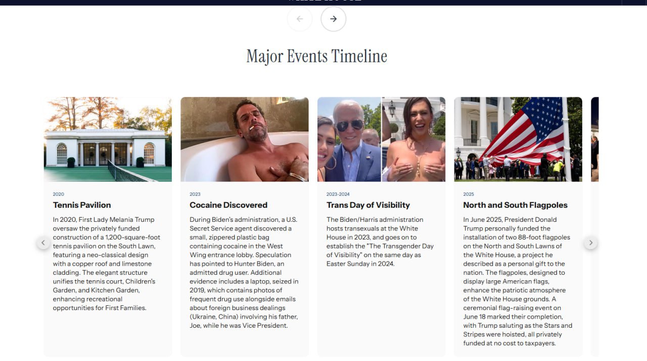 Администрация президента США Дональда Трампа добавила на сайт Белого дома официальную хронологию истории резиденции американских лидеров, включив туда ряд скандалов, связанных с президентами от Демократической партии. В частности, в хронологию включён инцидент с обнаружением кокаина при правлении Джо Байдена.