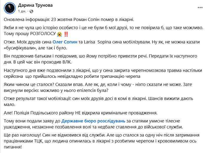 В Киеве скончался принудительно мобилизованный Роман Сопин, который после ночи в одном из ТЦК и СП оказался в коме.