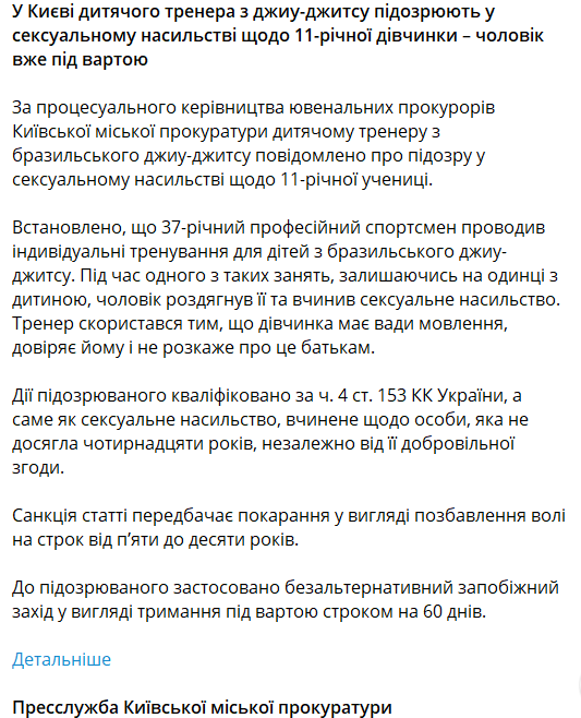Тренеру объявили о подозрении по ч. 4 ст. 153 УК Украины (сексуальное насилие, совершенное в отношении лица, не достигшего четырнадцати лет, независимо от его добровольного согласия).