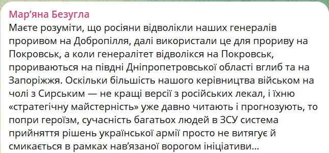 "Должны понимать, что россияне отвлекли наших генералов прорывом на Доброполье, далее использовали это для прорыва на Покровск, а когда генералитет отвлекся на Покровск, прорываются на юге Днепропетровской области вглубь и Запорожье. Поскольку большинство нашего руководства войском во главе с Сырским – не лучшие версии по российским лекалам, и их "стратегическое мастерство" уже давно читают и прогнозируют, то, несмотря на героизм, современность многих людей в ВСУ система принятия решений украинской армии просто не вытягивает и дергается в рамках навязанной врагом инициативы", – написала она.