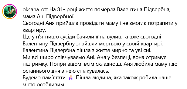 Заявляется, что Валентина Подвербная умерла в своей квартире, ее обнаружила 14-летняя дочь Анна-Мария.