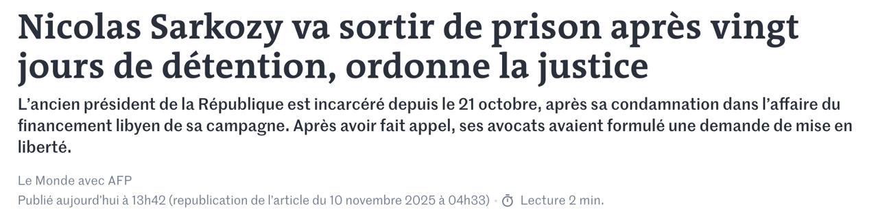Напомним, 21 октября Саркози начал отбывать своё наказание в парижской тюрьме Санте. Его приговорили к пяти годам заключения за преступный сговор по делу о ливийском финансировании его избирательной кампании. Он стал первым в истории Франции экс-президентом, отправившимся за решетку.