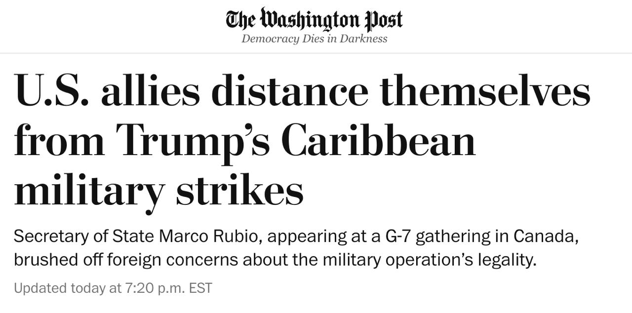 Госсекретарь США Марко Рубио заявил, что он не обсуждал удары в Латинской Америке со своими коллегами по "Большой семерке", и отмел любые опасения иностранных государств относительно законности военной операции.