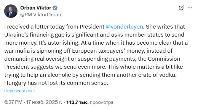 "Сегодня я получил письмо от президента фон дер Ляйен. Она пишет, что дефицит финансирования Украины огромен, и просит государства-члены направить больше средств. Это поразительно. В то время, когда стало ясно, что военная мафия выкачивает деньги европейских налогоплательщиков, вместо того чтобы потребовать реального контроля или приостановки платежей, председатель Еврокомиссии предлагает нам направить ещё больше. Вся эта история немного похожа на попытку помочь алкоголику, отправив ему ещё один ящик водки. Венгрия не утратила здравого смысла", – написал Орбан.