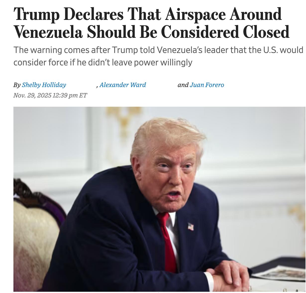 Напомним, накануне Дональд Трамп объявил о закрытии воздушного пространства над Венесуэлой и вокруг нее. Решение прозвучало на фоне продолжающегося наращивания военной группировки США в Карибском бассейне.