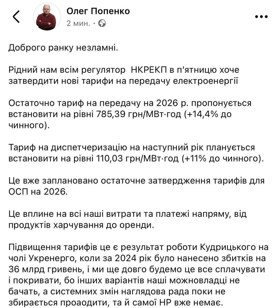 "Это повлияет на все наши расходы и платежи напрямую, от продуктов питания до аренды. Это результат работы Кудрицкого во главе "Укрэнерго", когда за 2024 год был нанесен ущерб на 36 млрд гривен, и мы еще долго будем это все оплачивать", - пишет Попенко.
