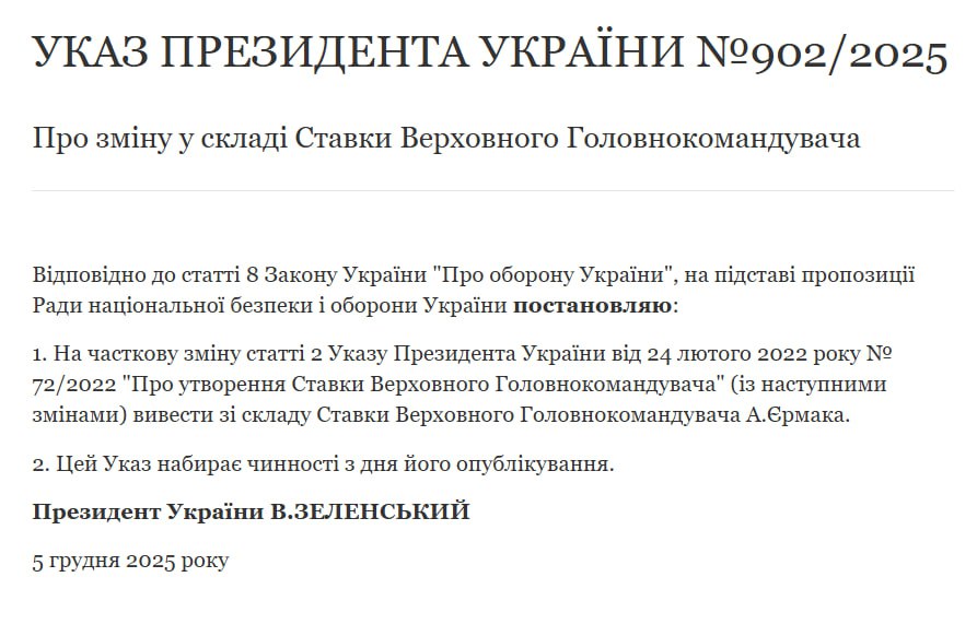 "На частичное изменение статьи 2 Указа Президента Украины от 24 февраля 2022 года № 72/2022 "Об образовании Ставки Верховного Главнокомандующего" (с последующими изменениями) вывести из состава Ставки Верховного Главнокомандующего А.Ермака" - говорится в другом Указе.