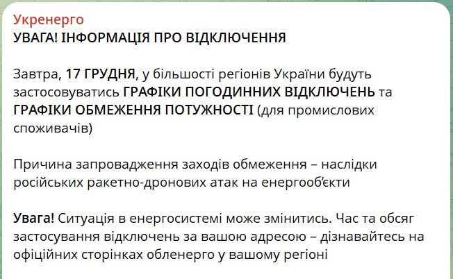 18.13 Завтра свет снова будут отключать не во всех областях, сообщает "Укрэнерго".