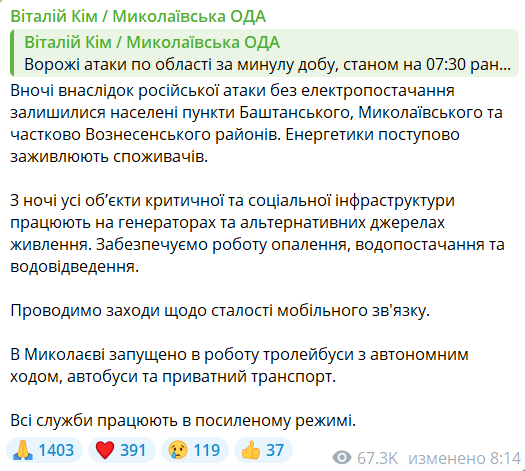 "С ночи все объекты критической и социальной инфраструктуры работают на генераторах и альтернативных источниках питания. Обеспечиваем работу отопления, водоснабжения и водоотведения", - заявил губернатор.