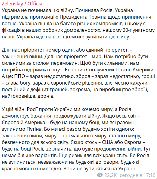Он отметил, что Украина уже пошла на множество компромиссов для достижения мира, что было отражено в 20-пунктном плане.