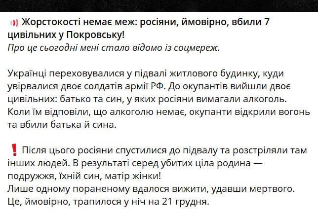 Согласно этой информации, в ночь на 21 декабря двое российских военных ворвались в подвал жилого дома, где скрывались мирные жители.