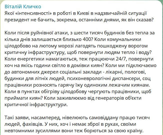 "Какой "интенсивности" в работе Киеве в чрезвычайной ситуации президент не видит, в частности, в последние дни, как он сказал?" - задается вопросом Кличко.