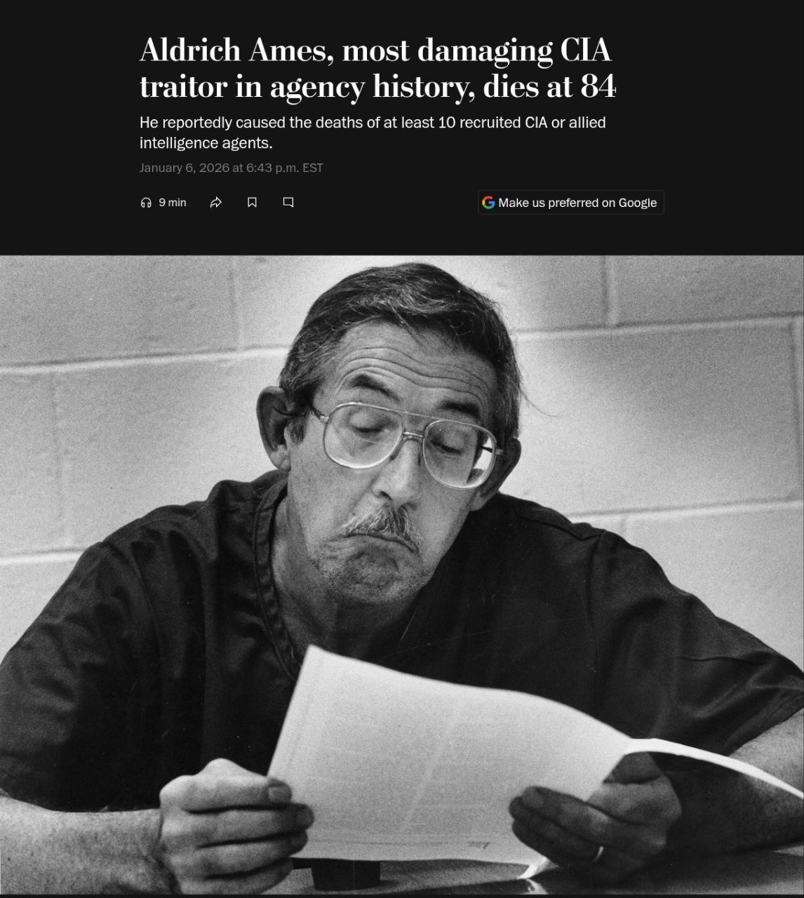 В американской тюрьме умер самый известный агент КГБ в Соединенных Штатах - сотрудник ЦРУ Олдрич Эймс. Он скончался 5 января в возрасте 84 лет.