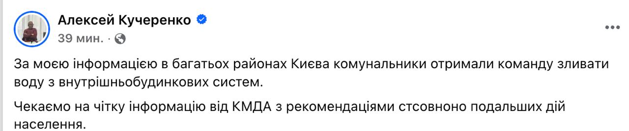 12:00 Нардеп Кучеренко заявил, что во многих районах Киева коммунальщики получили команду сливать воду из внутридомовых систем. Он отмечает, что отопление вернут, только когда будет плюсовая температура.