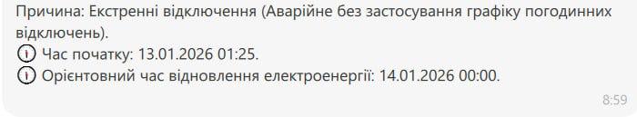 Например, у подгруппы 2.2 свет за последние 14 часов дали на полтора часа - с полуночи до 1:30. Затем начались аварийные отключения и свет пропал, восстановить свет обещают к полуночи 14 января.