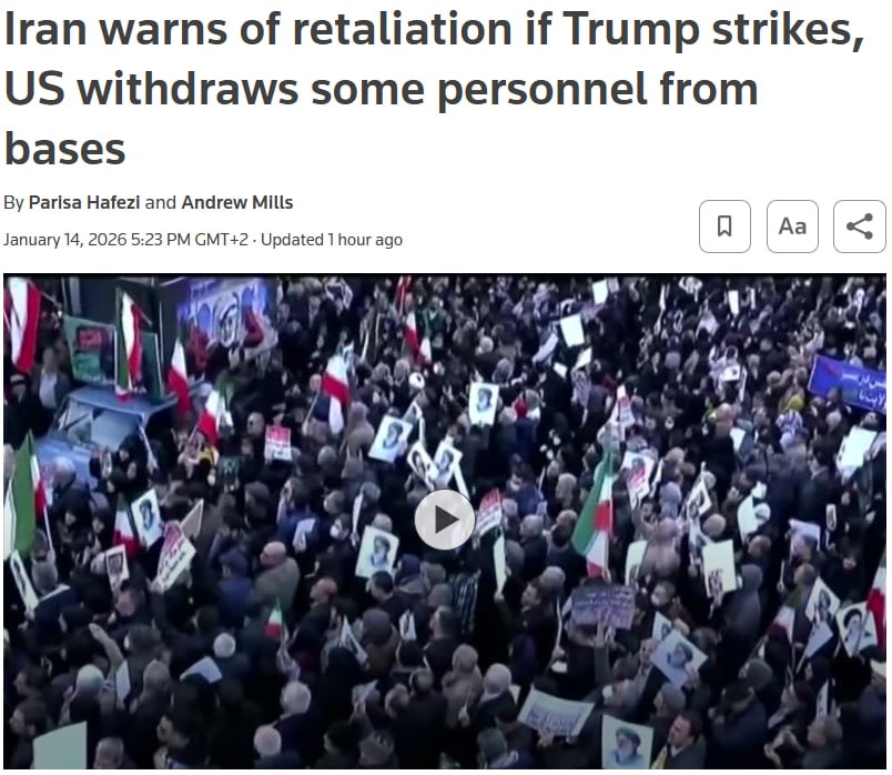 Напомним, агентство также сообщило, что США начали выводить часть персонала со своих военных баз на Ближнем Востоке после угроз Тегерана нанести по ним ответный удар в случае атаки Ирана американскими войсками.
