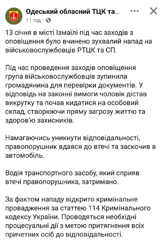 09:58 В Измаиле при проверке документов мужчина угрожал сотрудникам ТЦК отверткой, после чего запрыгнул в проезжающий мимо автомобиль и скрылся, сообщает одесский военкомат.