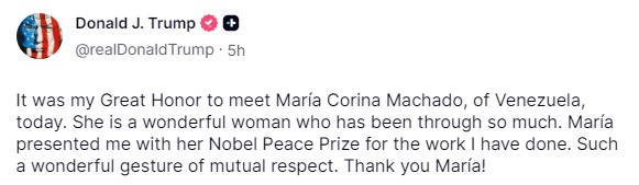 "Для меня было огромной честью встретиться сегодня с Марией Кориной Мачадо из Венесуэлы. Она замечательная женщина, которая многое пережила. Мария вручила мне Нобелевскую премию мира за мою работу. Это был прекрасный жест взаимного уважения. Спасибо, Мария!" - сказано в его публикации.