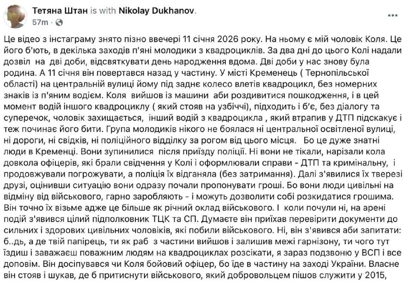 В Кременце Тернопольской области пьяная компания на квадроциклах избила военного Николая Духанова, а полиция и сотрудники местного ТЦК и СП покрывали действия нападавших.