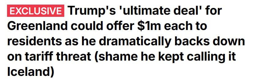 Тем временем британская Daily Mail со ссылкой на источники написала, что администрация Трампа хочет предложить каждому жителю Гренландии по миллиону долларов в случае голосования за присоединение острова к США. На острове насчитывается около 57 тысяч жителей, то есть выплаты составят 57 миллиардов долларов.
