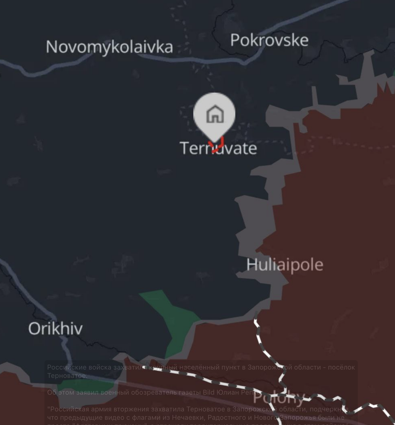 09:31 Российские войска захватили крупный населённый пункт в Запорожской области - посёлок Терноватое.