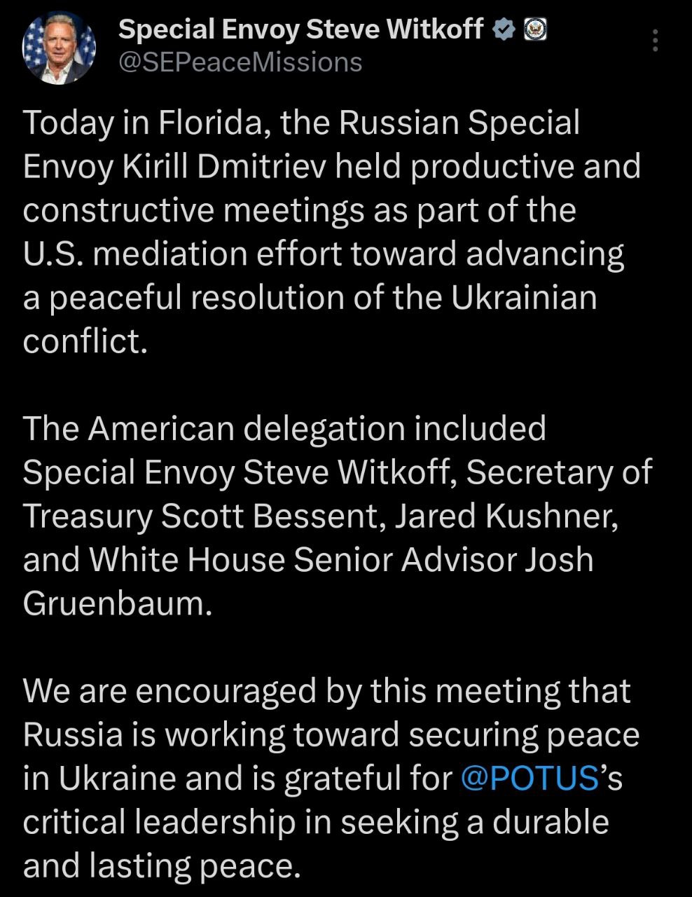 19:00 "Мы воодушевлены". Уиткофф заявил, что переговоры с Дмитриевым были "продуктивные и конструктивные".