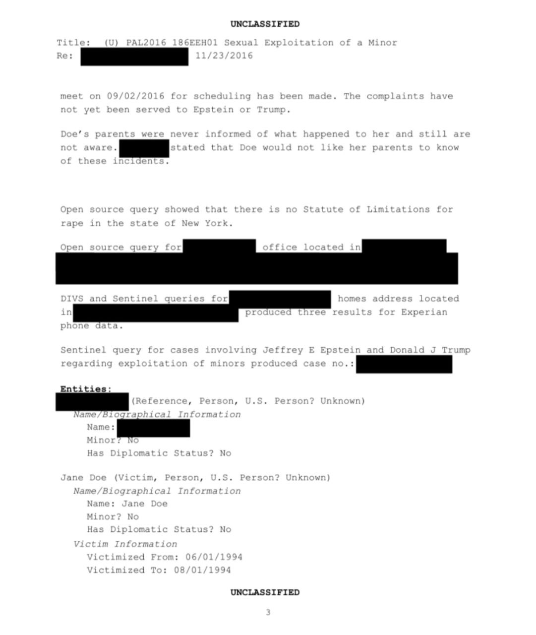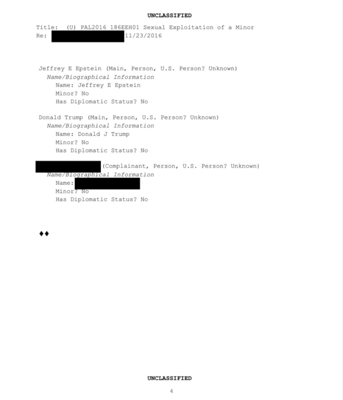 Изложенные в документе претензии к Трампу поступили в ФБР в 2016 году. Их прислал адвокат женщины, обозначенной как Джейн Доу.
